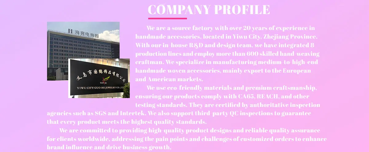Yiwu Guohe Jewelry Co Ltd is a professional Handmade jewelry Manufacturer, offering all kinds of handmade braided jewelry with customized service in Yiwu, with more than 10 years' factory experience.